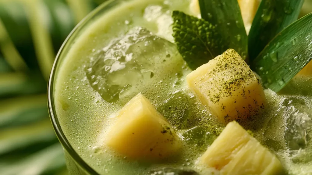 Si te gustan los sabores frutales y ligeros, prueba la versión tropical del smoothie de matcha para energía. Sustituye el plátano por ½ taza de piña fresca, usa agua de coco como base y agrega una pizca de jengibre rallado. Este batido te ayudará a hidratarte, mejorar la digestión y estimular tu metabolismo de manera natural. Su sabor fresco y dulce es perfecto para los días calurosos o después de entrenar.